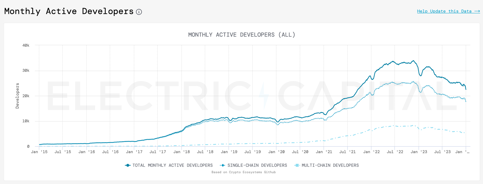 But there are other indicators that are useful — and that can provide us some good information if we pay attention. One of those indicators is the number of people actually working on and building decentralized apps and services using public blockchains.