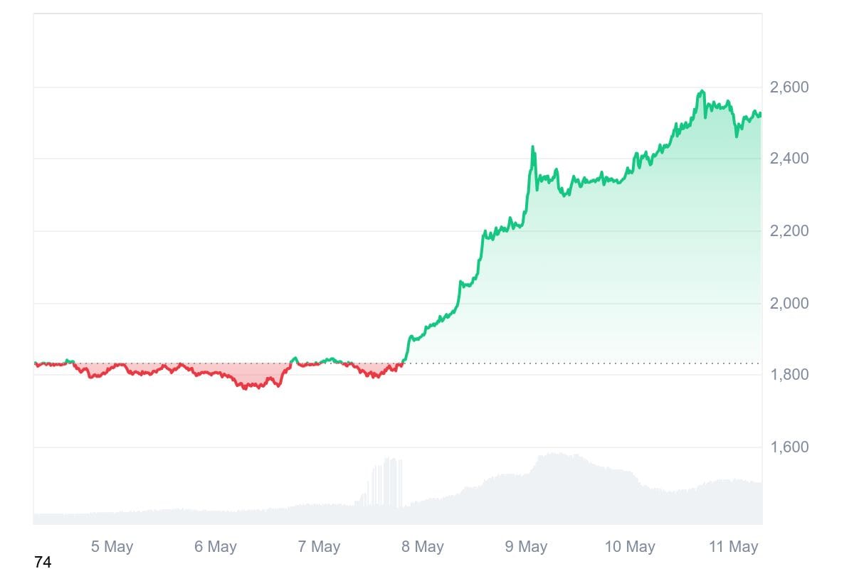 By May 9, ETH had surged past $2,500, logging its biggest weekly gain since 2021 — up nearly 30% in just five days. It wasn’t a random move. It was a cocktail of catalysts that hit all at once: