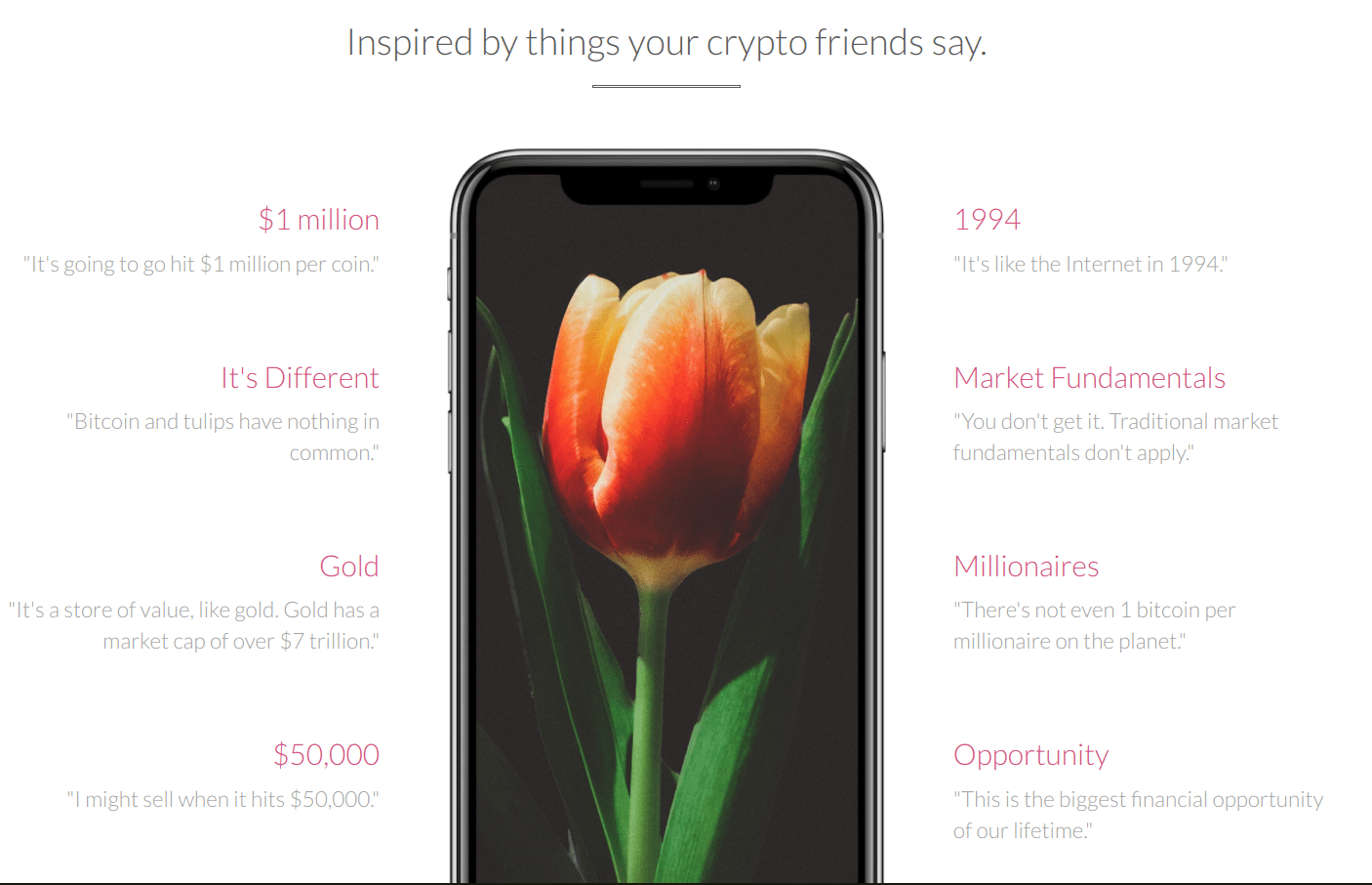So what began as something of a bitcoin meme has now become part of the crypto culture and will inevitably become part of the history of the developing economy. And in that spirit, it’s time to talk about one of the latest crypto-related tulip projects. Send Crypto People Tulips is a recently launched project that uses snarky humor (and photos of tulips) to remind crypto investors, speculators, and all-inners that cryptocurrency markets are bubbling and that the insane valuations will undoubtedly lead to dramatic corrections. Users of the service can pay $5 to input the phone number of a friend or colleague. When crypto markets crash, Send Crypto People Tulips will then text a photo of tulip and a snarky quote with a crypto cliche. Capping off the epic year in crypto, where the market cap grew from $18 billion at the beginning of the year to $600 billion by the end of the year, with a project that reminds us all to stay humble and stay focused is probably not a bad thing. If nothing else, the snarky samples are at least good examples of things crypto headline writers should avoid in the future.