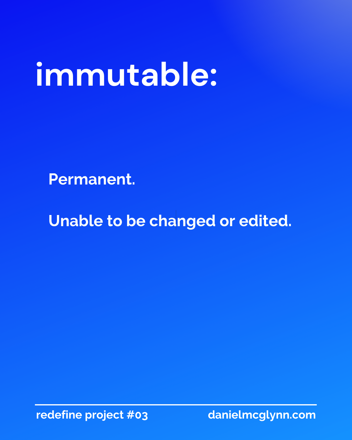 Immutable means permanent or unable to be changed, altered, or edited.